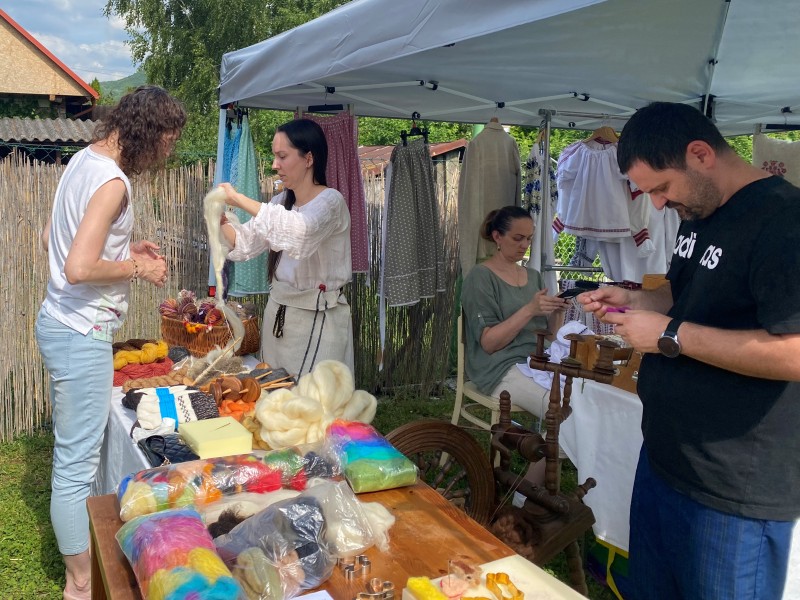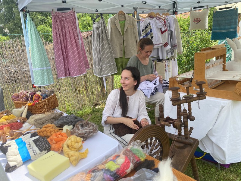 Pozorovať sme mohli prácu tkáčky na krosnách i priadky na kolovrátku. Deti si vyskúšali aj plstenie:)
